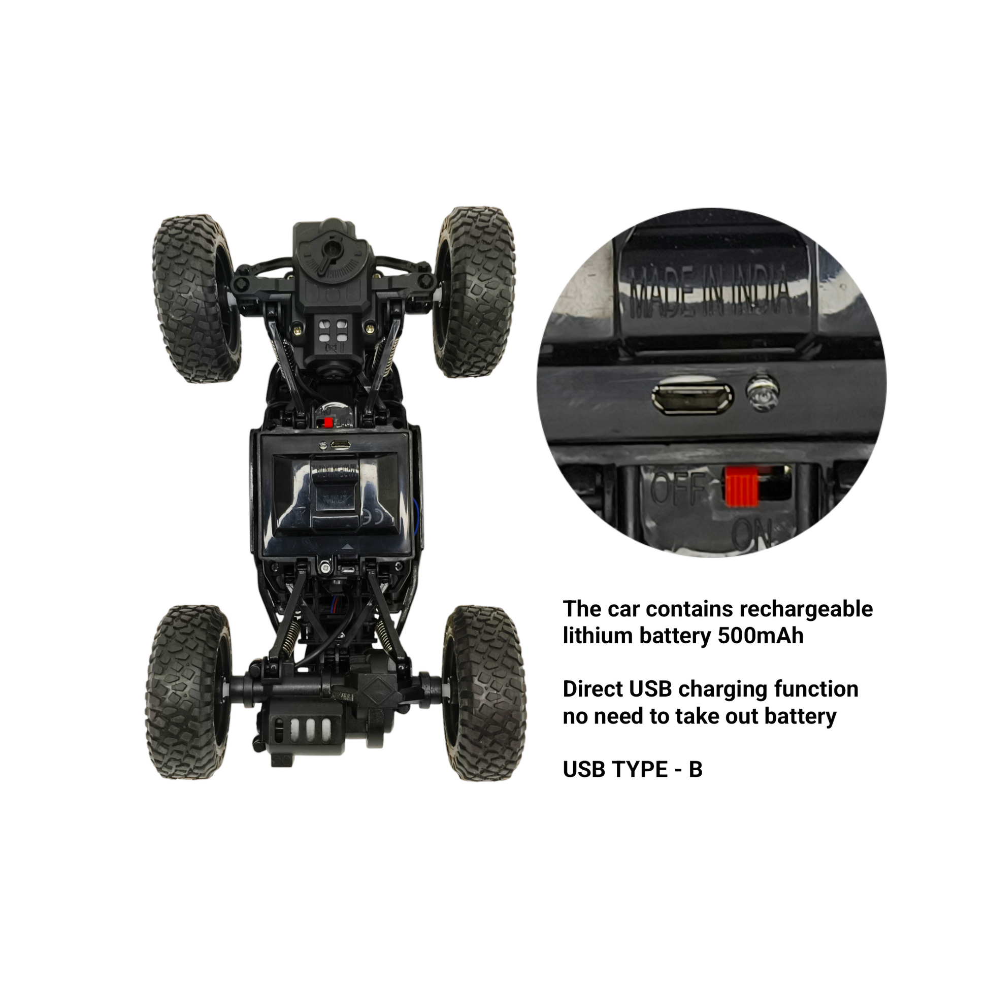 Rechargeable Battery (Car) – Includes USB charging cable.